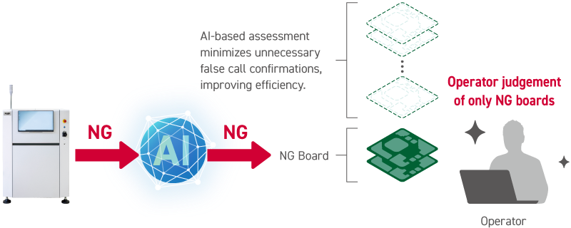AI performs a second assessment on parts marked NG, drastically reducing the operator’s workload by requiring manual verification only for AI-determined NG parts. This system helps prevent overlooked errors caused by misjudgment.
