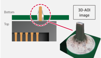 Achieves high-precision inspection of characters and polarity on components with a maximum component height of 10mm. By focusing on both the board surface and the component surface, solder inspection and character polarity inspection can be performed simultaneously.