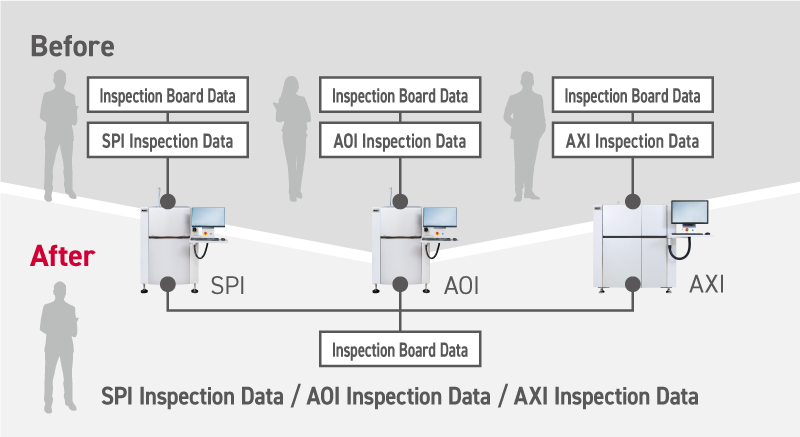 Standardized inspection program data for SPI, pre-AOI, post-AOI, and AXI eliminates duplicate tasks and reduces line setup time to approximately one-third.