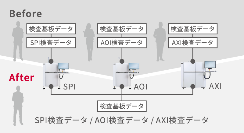 SPI / Pre AOI / Post AOI / AXIの検査プログラムのデータが共通化され、プログラム作成における重複作業をなくします。